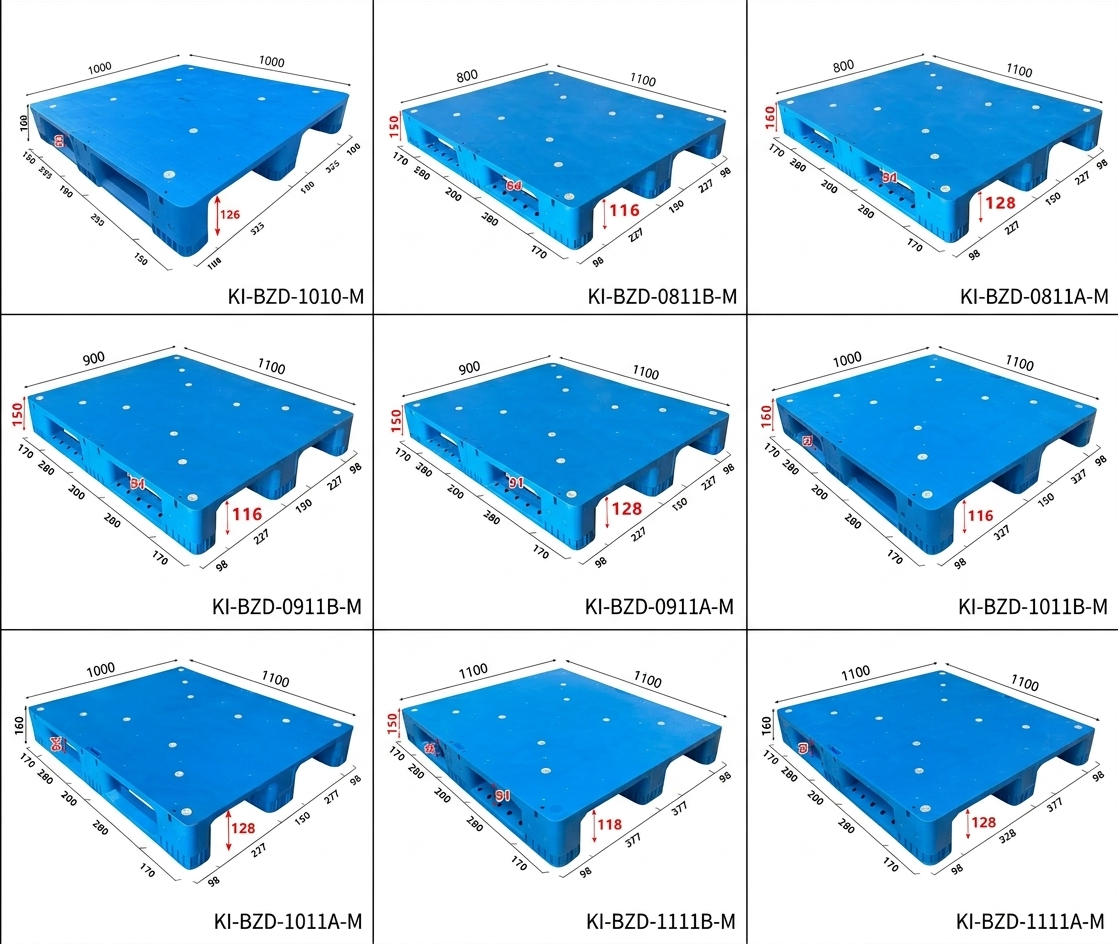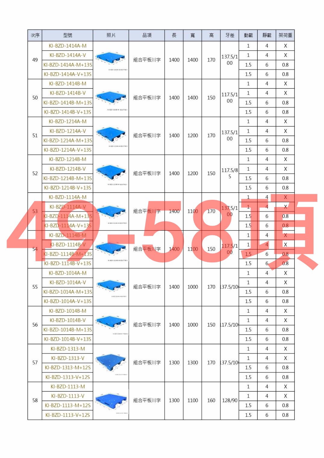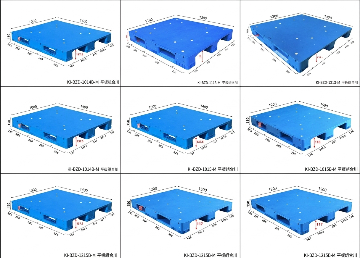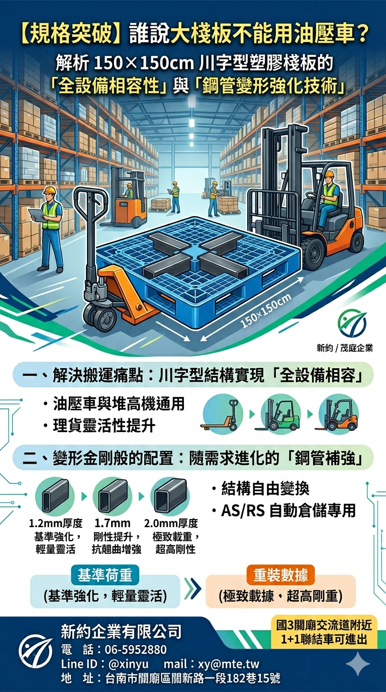 在工業物流的實務操作中,尋找 150×150cm 以上的大規格塑膠棧板已經不容易,而最讓採購與倉管頭痛的,莫過於這些大棧板通常被設計為(雙面型或田字型),導致一般的油壓拖板車與部分特殊機型堆高機完全無法進入操作。新約 / 茂庭企業 突破市場限制,此系列共76項尺寸(持續增加中)提供從超大規格 150×150cm、150×130cm 到最小規格 60×80cm 的全尺寸解決方案,並堅持採用 「川字型」結構,讓您的搬運設備不再受限。