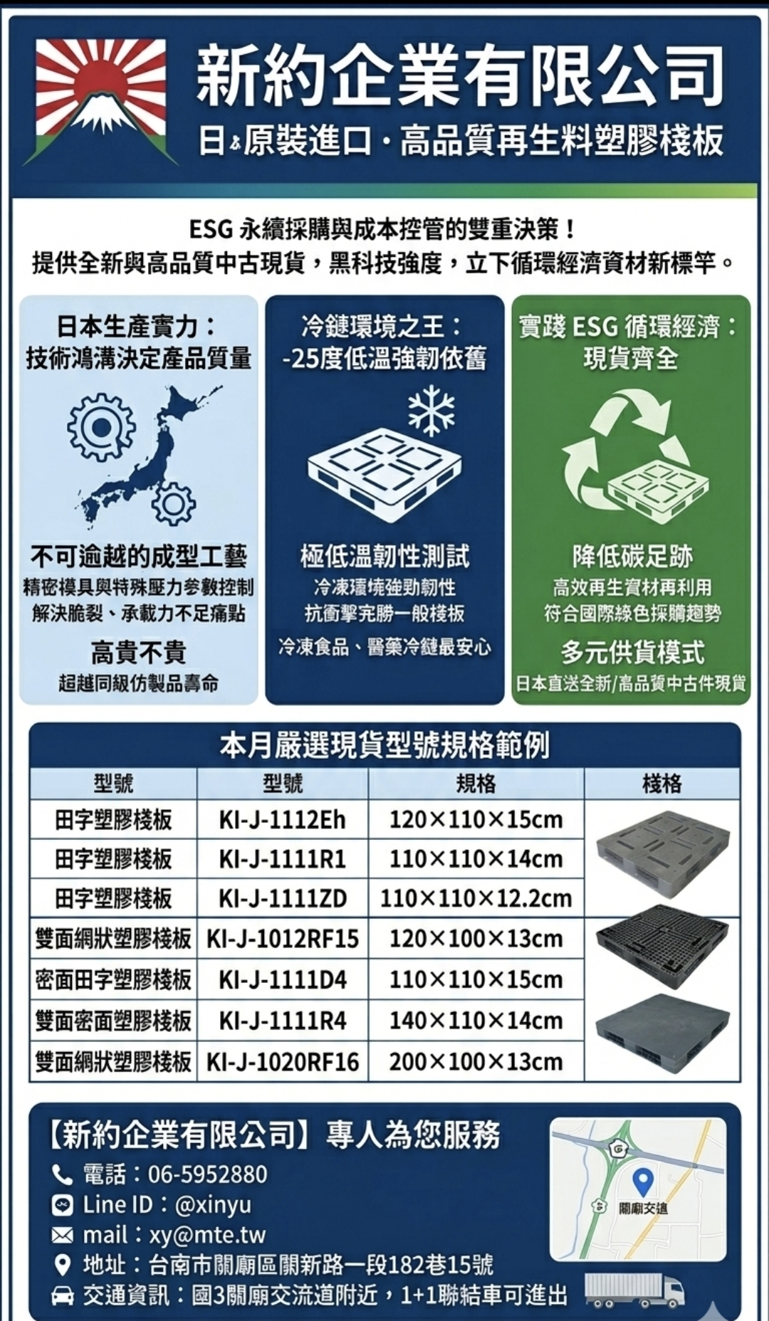 選購新約/茂庭的日本進口棧板,不僅是保障貨物安全,更是企業實踐 ESG 永續管理 的具體展現。高品質中古件更能在有限預算內提供頂級防護,落實資源循環再利用。