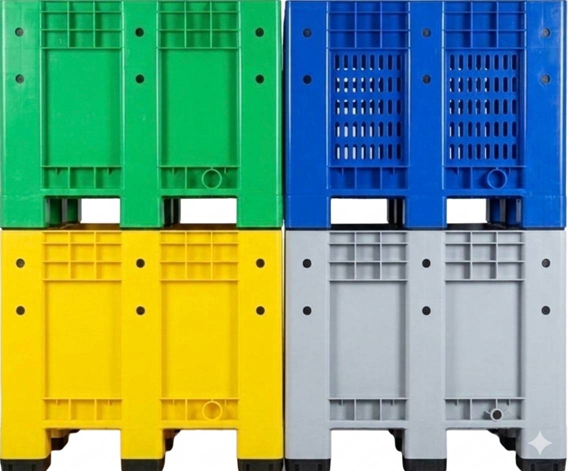 • A: 工業大塑膠箱具備標準化棧板基座,支撐多層高位堆疊,且具備耐衝擊、耐酸鹼特性,是專為重工業與物流環境開發的專業載具。