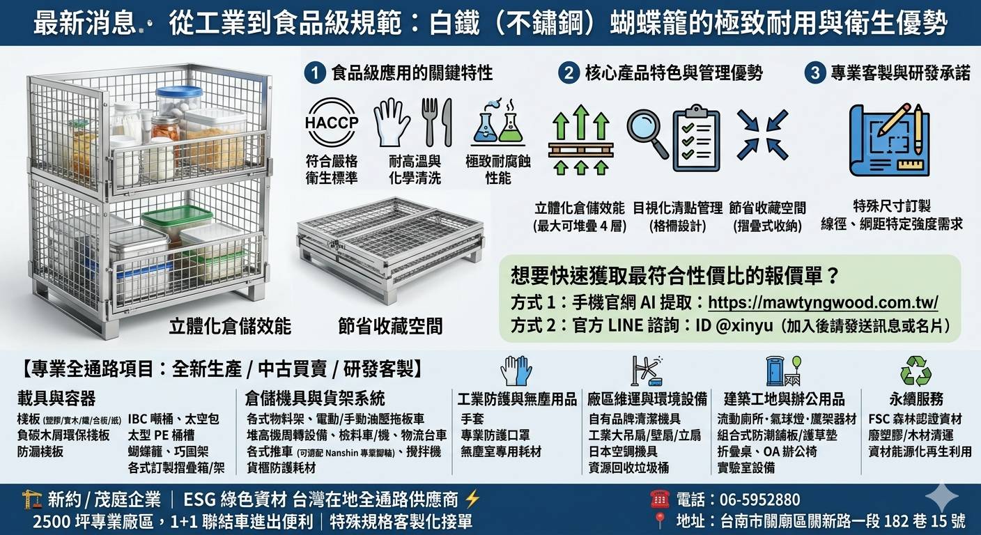 在生技製藥、食品加工或高酸鹼腐蝕環境下,物流載具的材質直接影響產品的安全性與企業的合規性。雖然電氣鍍鋅載具能應對一般工業環境,但在高濕度或需頻繁化學消毒的場景下,白鐵(不鏽鋼)蝴蝶籠 才是確保「零污染」與「長壽命」的終極解決方案。新約 / 茂庭企業 專為潔淨室環境研發,提供符合食品、醫療級規範的高規格不鏽鋼倉儲籠,協助企業落實 HACCP 與 GMP 等嚴格標準。