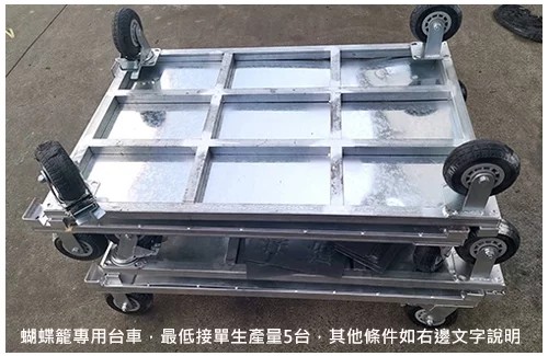 蝴蝶籠專用台車,最低訂購生產量20台,正常不會有庫存,接單生產,交期:下單後30±10天左右交貨,暫時有3個規格,配合型號為:A3,A5,A7型號,台車總高度約15cm,尺寸跟上述型號一樣,放下去會剛好卡住不會亂跑。