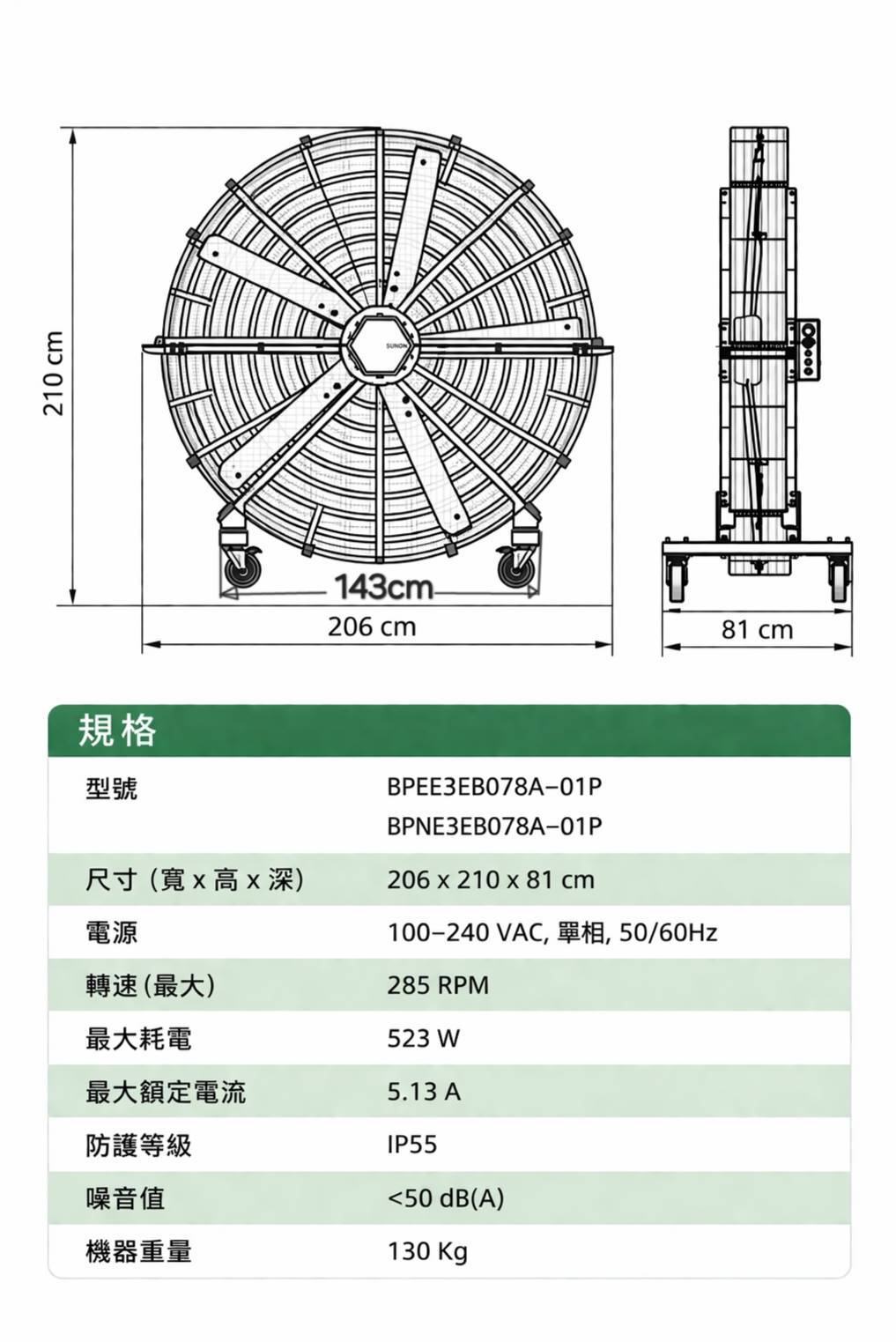 SUNON立扇,是一款高機動性且風力強大的定向風扇,2M高的大型立扇僅需單人操作即可輕鬆移動到任何需要空氣對流與降溫的地方。
