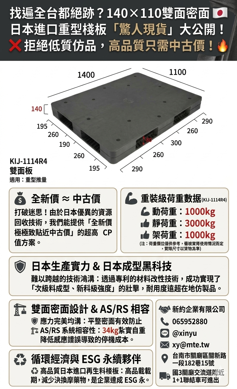 別再拿規格不合的載具勉強湊合,損害您的昂貴貨物!新約/茂庭企業 正式引進 🇯🇵 日本生產進口 的重裝級載具(型號:KIJ-1114R4),徹底解決重工業與自動化倉儲對於特殊尺寸與極致荷重的渴求。重點是:全新價格竟然跟中古差不多! 💰