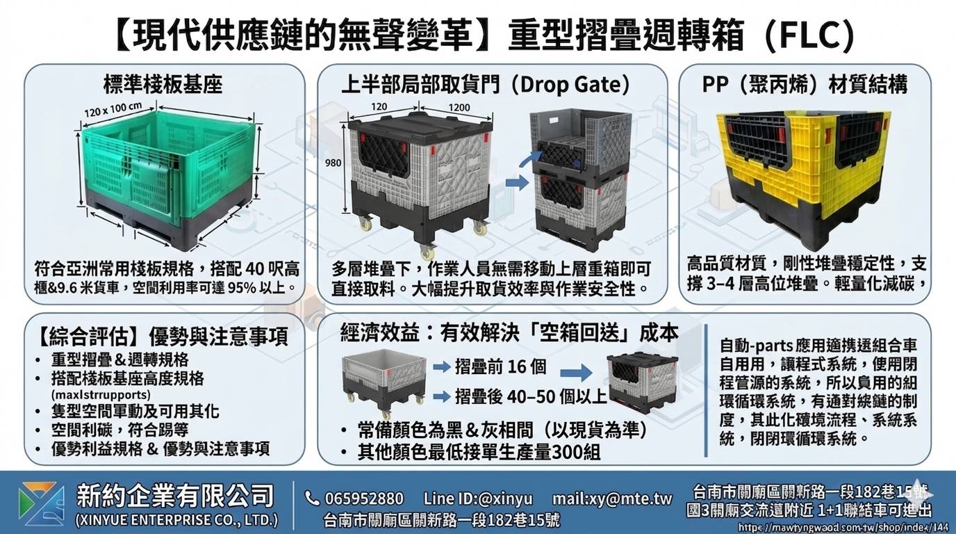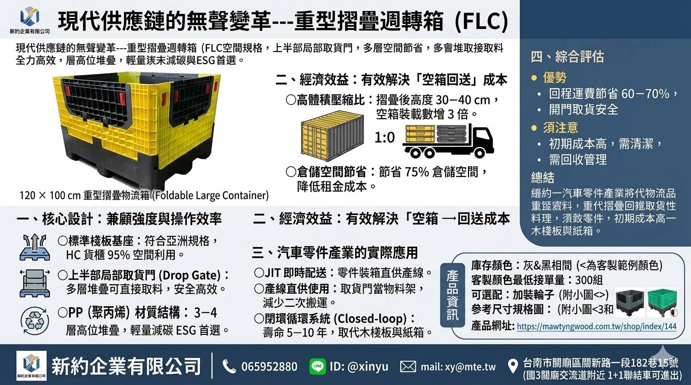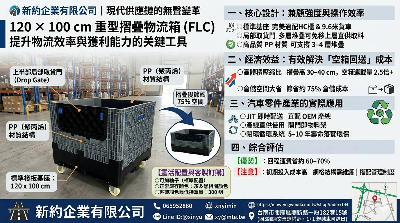 在亞洲高度精密的工業供應鏈中,物流效率往往取決於包裝容器的標準化與靈活運用。120 × 100 cm 重型摺疊物流箱(Foldable Large Container, FLC),正逐漸成為汽車零組件、電子製造與跨境貿易中,提升營運效率與落實 ESG 減碳目標的核心工具。