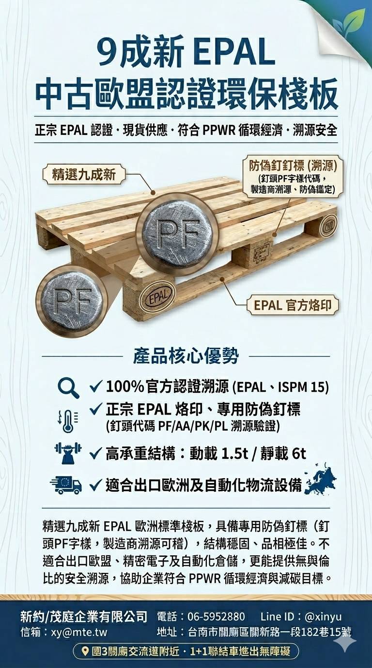 🌲🇪🇺在全球供應鏈邁向減碳的進程中,歐盟針對包裝資材的法規日益嚴格。隨著 PPWR(包裝與包裝廢棄物法規) 即將於 2026 年 8 月全面強制適用,出口企業對於載具的「合規性」與「可溯源性」需求已達臨界點。新約 / 茂庭企業 作為專業物流資材供應商,正式解析如何透過「認證釘標」與「烙印」辨識正品 EPAL 棧板,並提供 9 成新與全新載具方案,助企業穩定佈局歐洲市場。