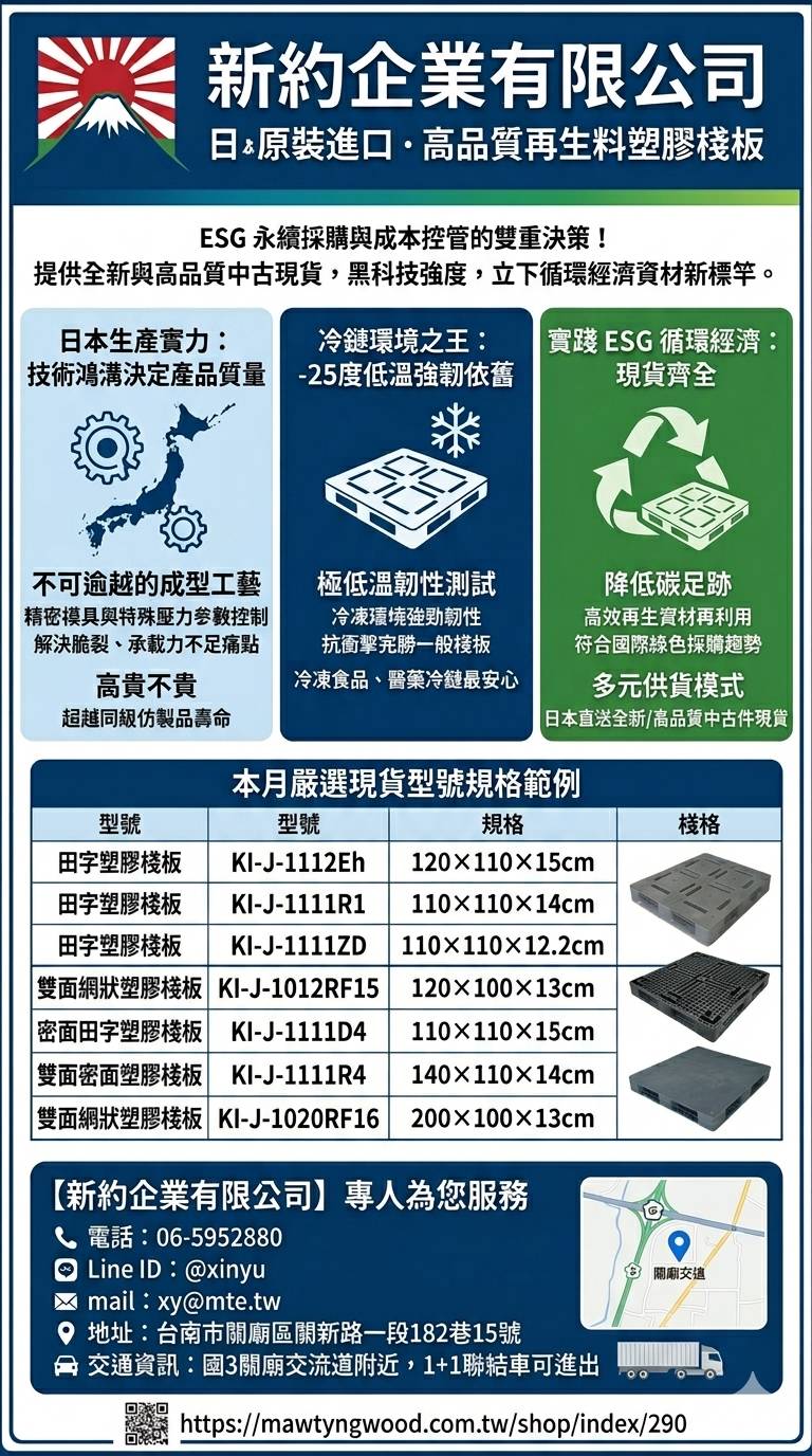 我們的日本進口棧板(全新/中古皆有現貨)不僅單價具備競爭力,更落實了節能減碳的環保目標。透過日本頂尖的資源利用技術,大幅降低產品碳足跡,是企業邁向永續採購、實踐減碳政策的最佳夥伴。