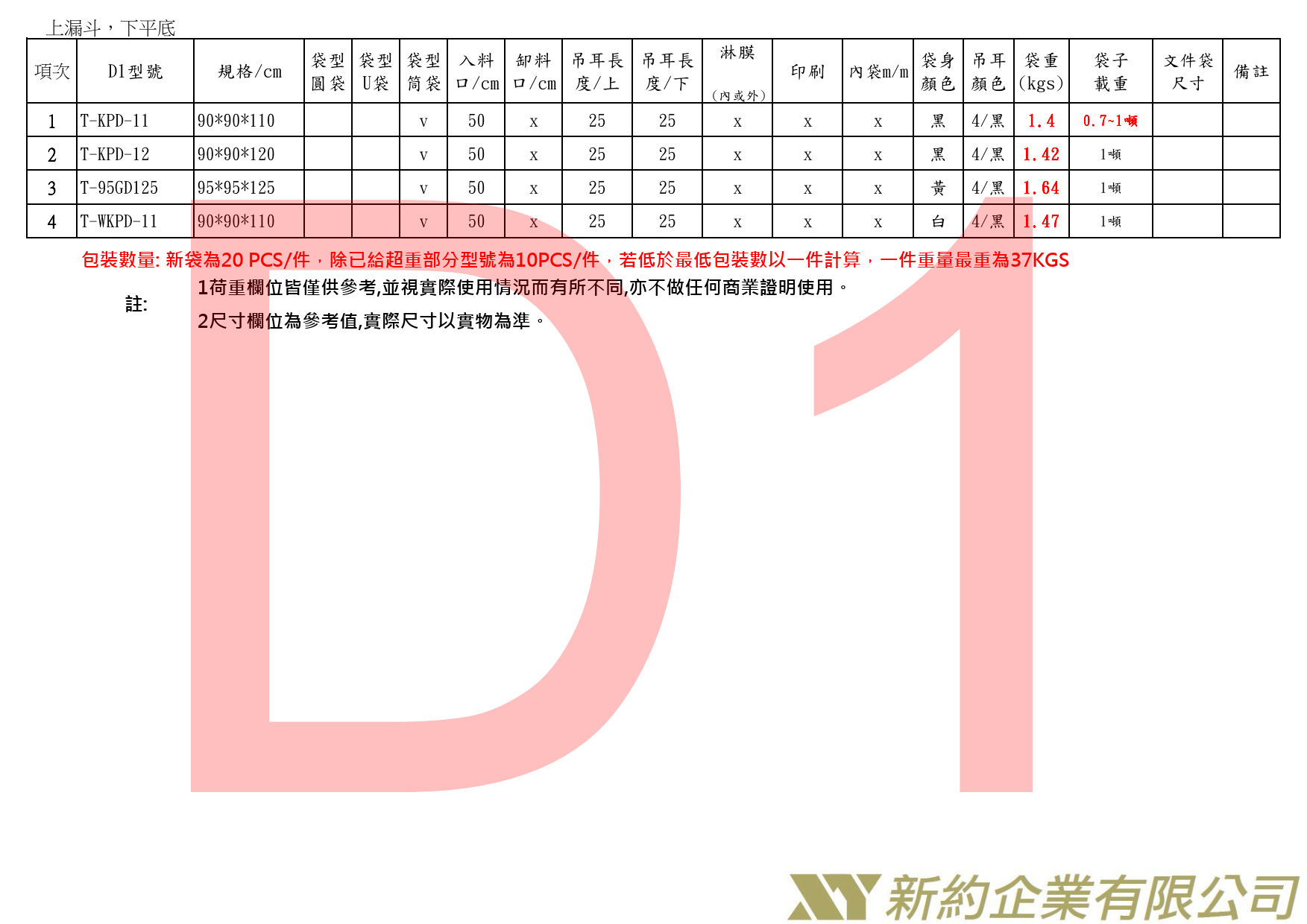 1.裝載物需平均荷重且不能有尖銳物,如尖銳物造成袋子破損發生工安或強度減弱,我們皆不負責後續問題,請自行注意使用安全,表格荷重皆以裝全新塑膠粒狀物(圓滑類似米粒大小顆粒狀)為使用標準。