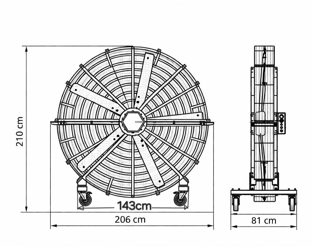 SUNON立扇,是一款高機動性且風力強大的定向風扇,2M高的大型立扇僅需單人操作即可輕鬆移動到任何需要空氣對流與降溫的地方。